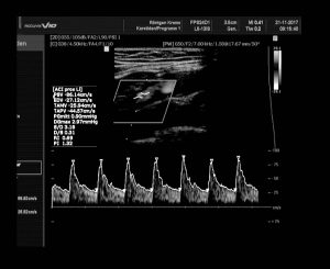 Diese Methode bedient sich des Doppler-Effektes zur Darstellung des Blutflusses, nämlich der Flussrichtung und Geschwindigkeit anhand der Frequenzverschiebung der reflektierten Schallwellen. Duch Messung der Strömungsgeschwindigkeit kann der Stenosegrad eines Gefäßes bestimmt werden.